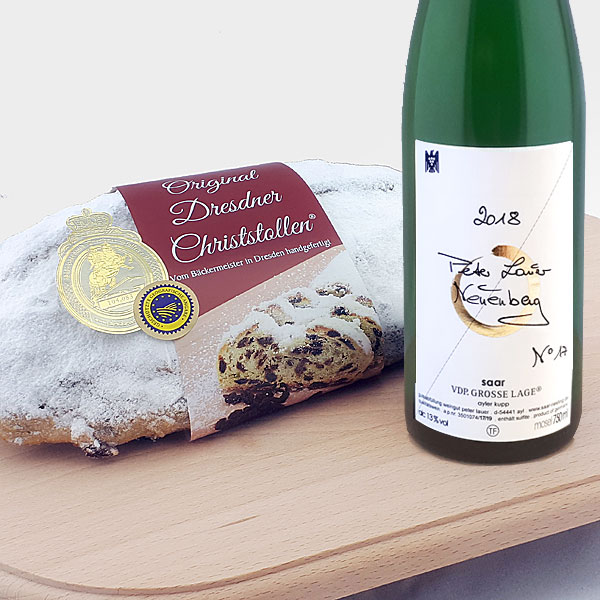 Sie erhalten hier einen Stollen mit 1000 g Gewicht und dazu eine Flasche Riesling Neuenberg 17, 2018 vom Weingut Peter Lauer.