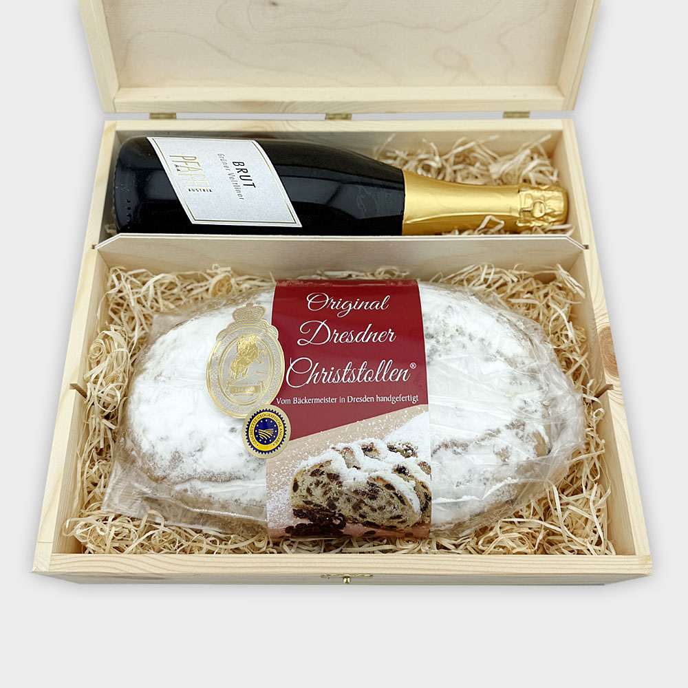Geschenkset – Original Dresdner Christstollen® 1000 g und Pfaffl Grüner Veltliner Sekt BRUT 0,75l (Flaschengärung) in der Holzkiste
