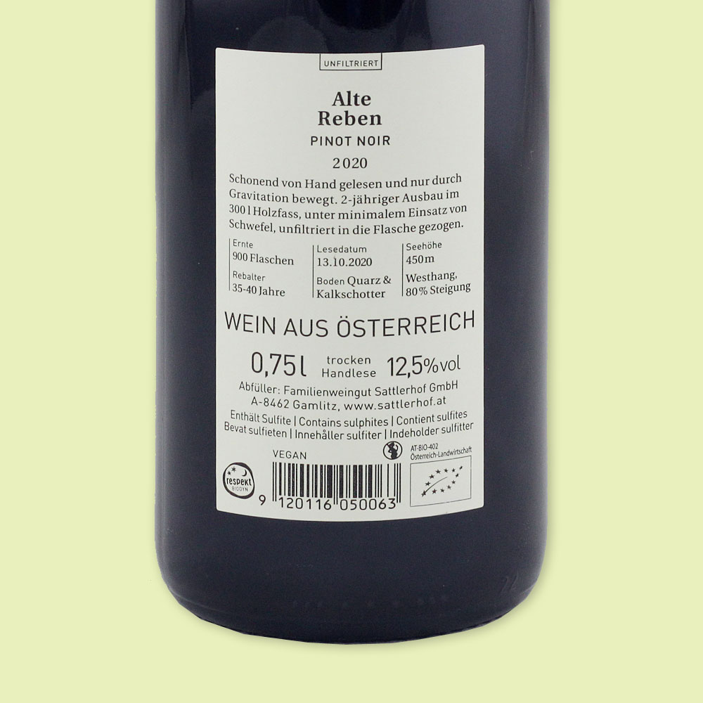 • Eine Flasche Blauburgunder Pinot Noir Alte Reben Weingut Sattlerhof 2020, Gamlitz, Südsteiermark, Österreich Trocken (0,75 l)
